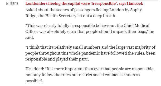 漢考克對媒體表示:“這(逃離倫敦)顯然是一種完全不負責任的行為,首席醫療官絕對清楚,人們應該做的是待在原地。”