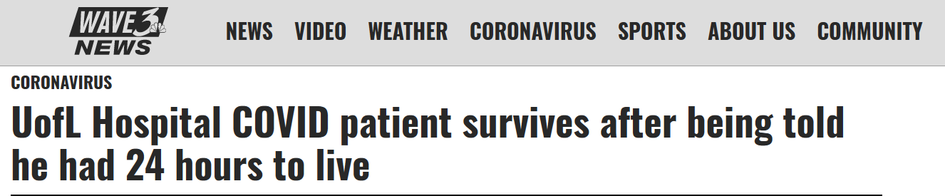 【環球網報道 記者 趙建東】美國路易斯維爾市一名新冠患者在入院被醫生判定只能活24小時後,又活了下來。當地媒體Wave 3新聞18日這樣報道。