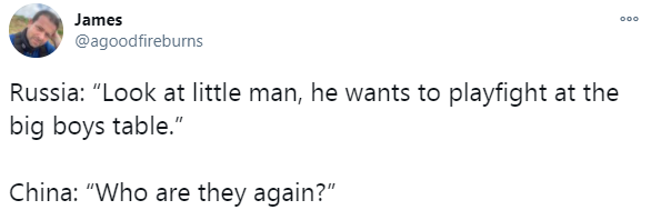 還有網友模仿起了中國和俄羅斯的口吻這樣寫道:俄羅斯:“看看這個小個子,他想在大男孩的桌上打一架。”中國:“他們又是誰?”↓