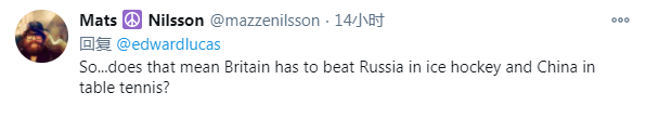 比如有人説, “那麼……這是不是意味着英國必須在冰球比賽中擊敗俄羅斯,在乒乓球比賽中擊敗中國?”↓