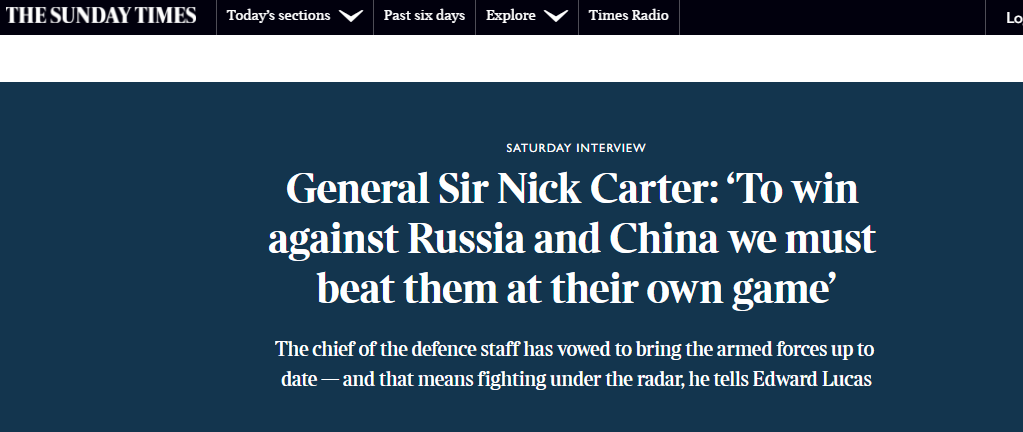 RT則在轉述時説,卡特在採訪中把莫斯科形容為“嚴重威脅”,而中國被形容為“長期挑戰”。這位英國將軍相信,如果英國要應對來自這兩個國家的威脅與挑戰,英國就需要一份“新戰略”,於是卡特説了開頭的那段話:“想戰勝俄羅斯和中國,我們必須在他們自己的遊戲中擊敗他們,這意味着要在低於戰爭門檻的(鬥爭中)擊敗他們”。