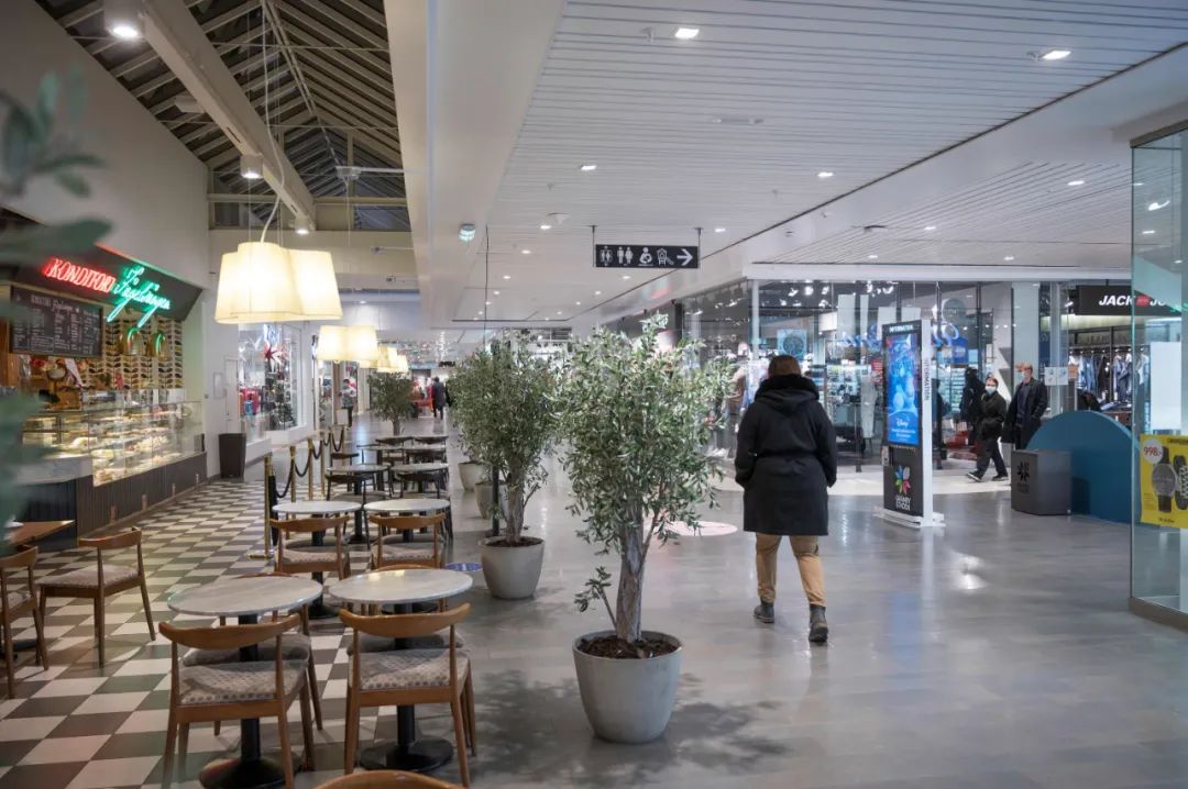 12月18日,在瑞典烏普薩拉的一家購物中心,行人從空蕩的餐桌椅旁經過。新華社/法新