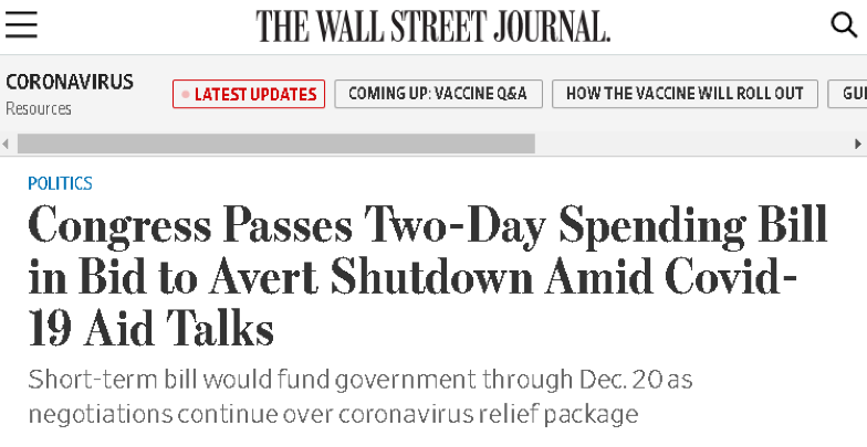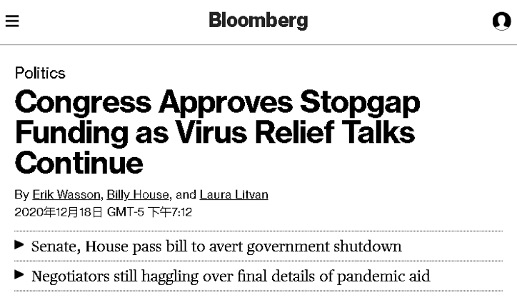 但由於紓困談判在12月18日出現卡殼,美國國會只好在當日晚間緊急通過了一項為期兩天的臨時性支出法案,並將其送交白宮簽署,以避免午夜後聯邦政府部分“關門”,此舉旨在為圍繞新一輪紓困法案的談判贏得時間。