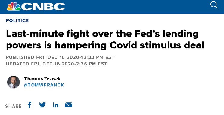 △CNBC稱,最後一刻關於美聯儲貸款權限的爭議,導致紓困談判再度拖延
