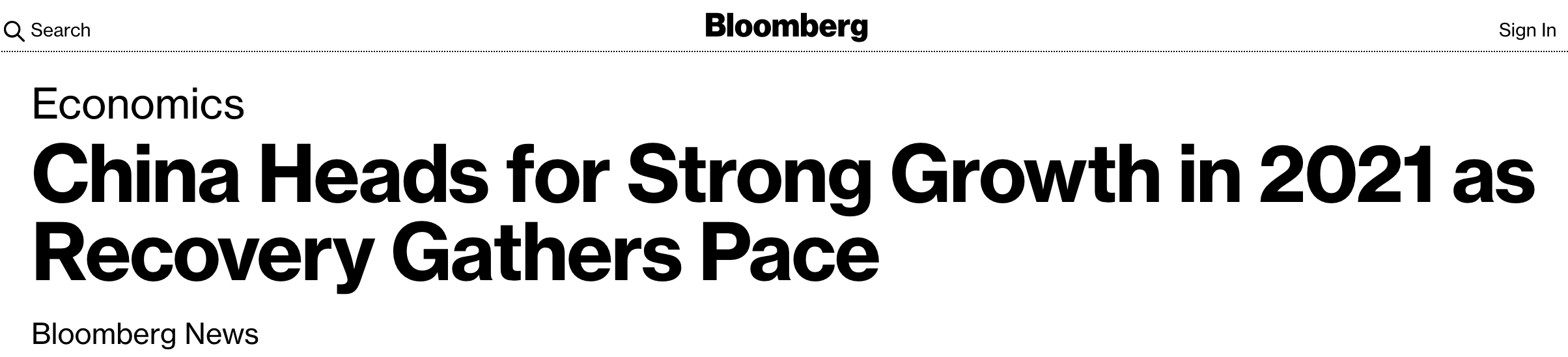彭博社近日發文稱,中國國家統計局發佈的2020年11月份國民經濟運行數據顯示,11月,隨着工業產出和零售額的增長,中國進一步領先於其他主要經濟體,2021年經濟健康增長的預期進一步增強。