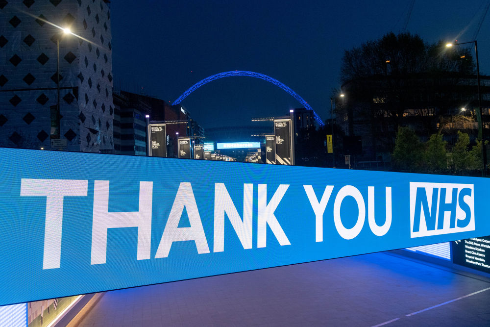 英國倫敦温布利球場4月9日晚8時點亮象徵英國國民保健制度(NHS)的藍燈,以示對抗擊新冠肺炎疫情的醫護人員的敬意。新華社發(雷伊·唐攝)