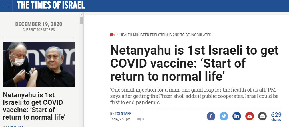 《以色列時報》:內塔尼亞胡是第一個接種新冠疫苗的以色列人,“開始恢復正常生活”