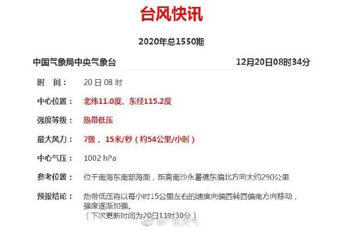 今天8時,位於南海東南部海面,距離南沙永暑礁東偏北方向大約290公里的熱帶低壓是這個樣子的,隨後將以每小時15公里左右的速度向偏西轉西偏南方向移動,強度逐漸加強。