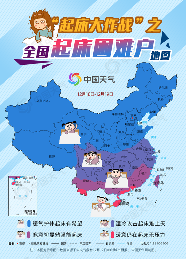 中國天氣網發佈了全國起牀困難户地圖,來看各地“起牀大作戰”如何上演。