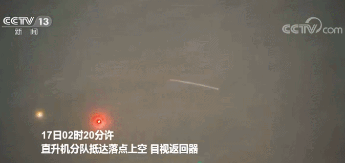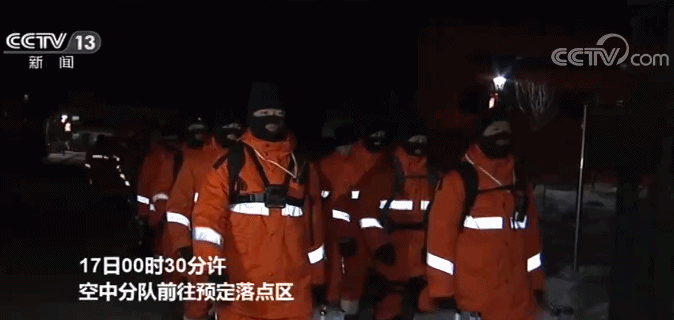 總枱央視記者 王剛: 現在是17日零點三十分,我們接到了北京中心的第一次落點預報,所以現在我跟隨我們的直升機分隊的搜救隊員一起登機,前往指定的空域。