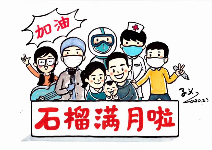 △插畫師網友為小石榴寶寶手繪了一張“滿月全家福”,一直關注着寶寶的醫護人員、記者、熱心網友等也都出現在這張全家福中。