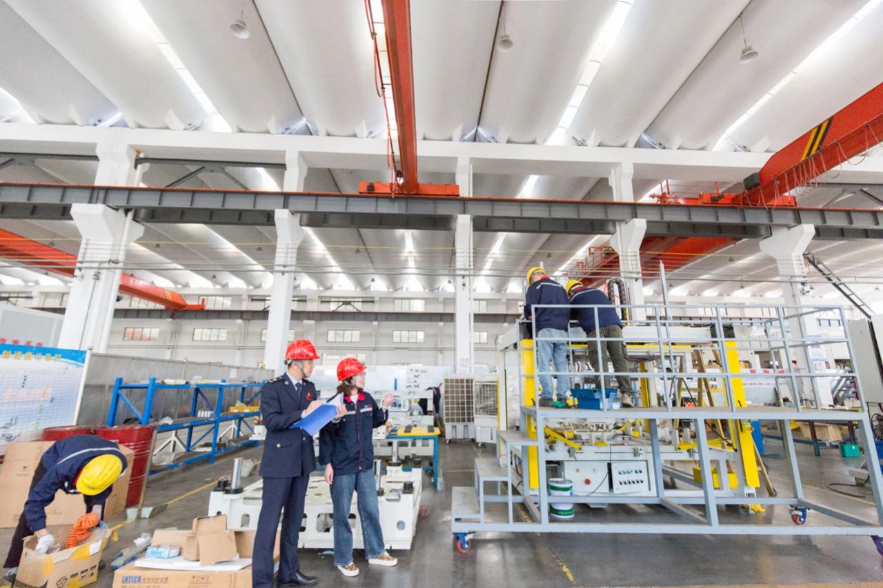 △2020年10月10日,在江蘇南通如皋市瀚皋機械設備有限公司生產車間內,税務局工作人員在對出口產品訂單量及生產情況進行實地瞭解。
