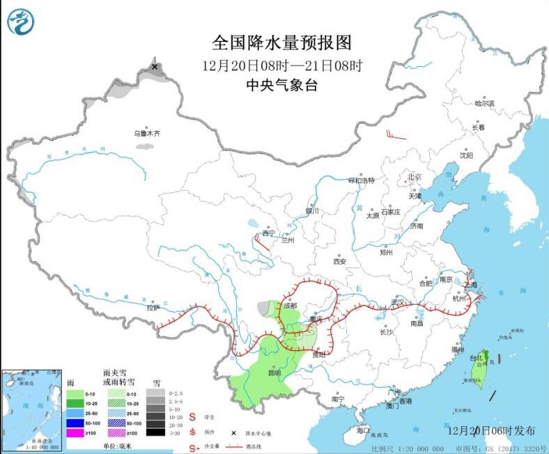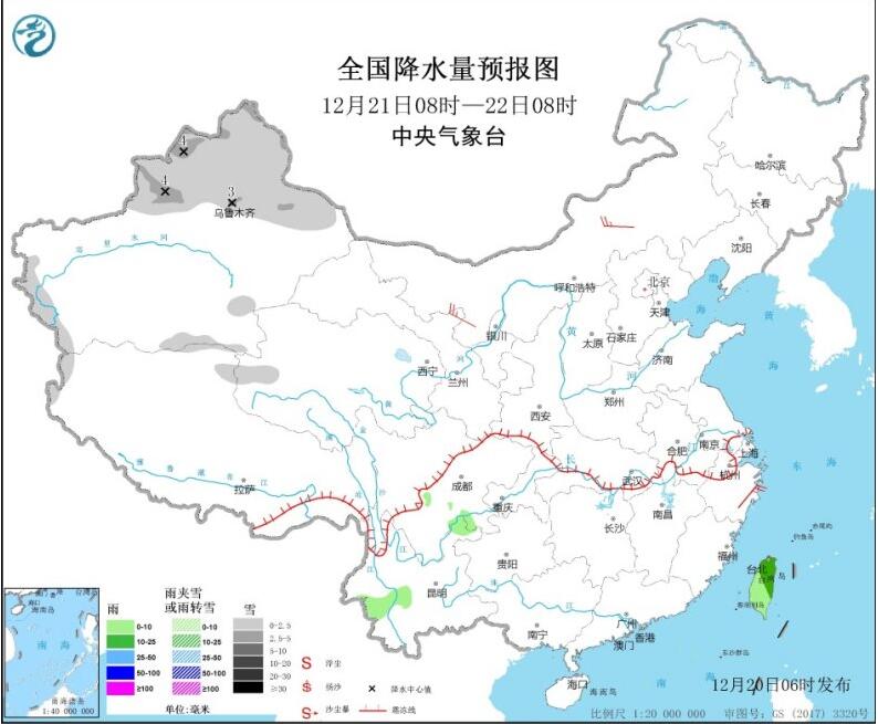 12月20日08時至21日08時,新疆西部、川西高原部分地區、貴州西北部等地有小到中雪或雨夾雪(2.5~4毫米)。四川盆地南部、雲南大部、貴州西南部、台灣等地部分地區有小雨,其中台灣東部有中到大雨。內蒙古東部、東北等地有4~6級風。