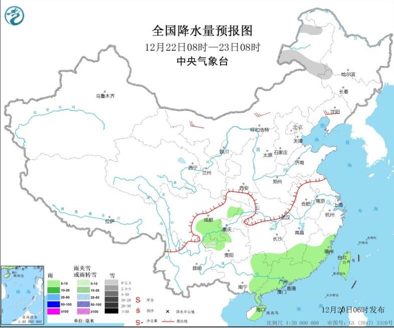 12月22日08時至23日08時,內蒙古東北部、吉林西部等地部分地區有小雪。四川盆地南部、江南南部、華南大部、台灣島等地有小雨。內蒙古、東北等地有4~5級風。