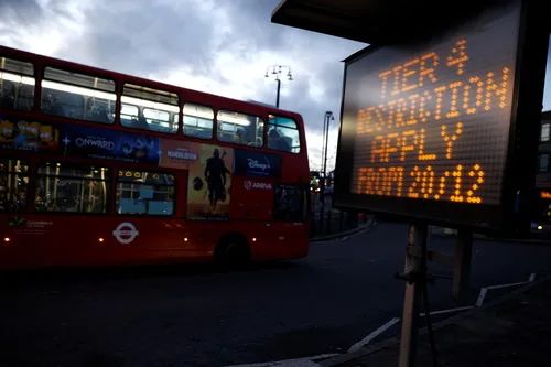 12月20日,在英國倫敦,一輛巴士經過顯示“12月20日起實施新冠疫情防控級別第四級”字樣的電子屏。新華社/路透
