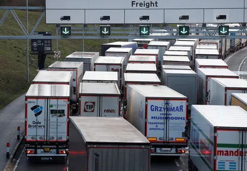 12月20日,在英國福克斯通,貨車排隊等待登上去往法國的貨運列車。福克斯通為英吉利海峽海底隧道西端入口。新華社/路透