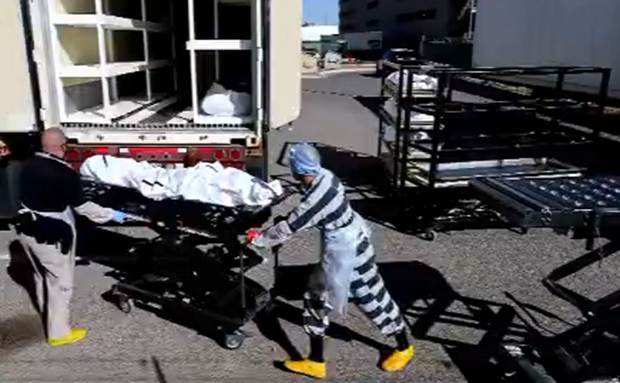 △媒體照片和視頻顯示,屍檢官辦公室外停着多輛白色冷藏拖車,多名穿條紋囚服、戴口罩和防護手套的人把屍體搬運上車