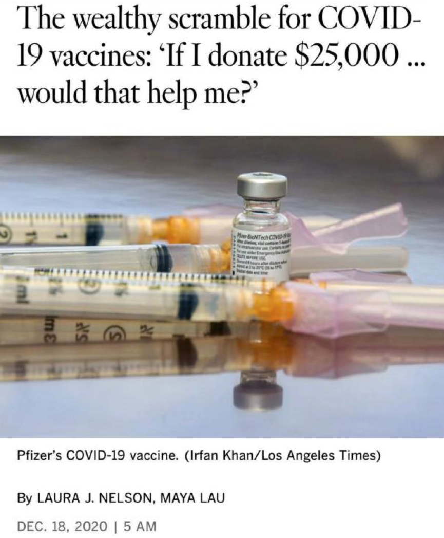 △《洛杉磯時報》報道,美國富人正在市場上高價爭搶新冠疫苗