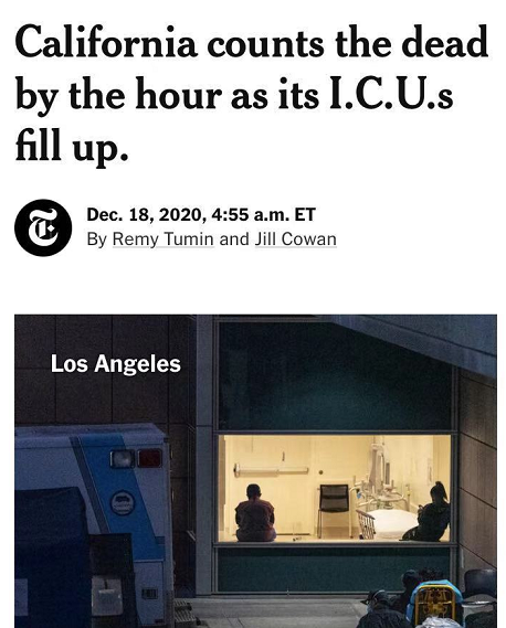 △《紐約時報》報道,加州洛杉磯縣平均每小時有2人死於新冠肺炎,每80人中有1人被感染