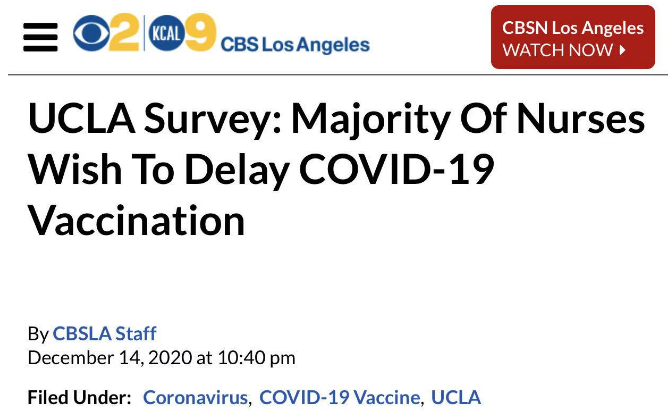 美國加州大學洛杉磯分校對當地醫護人員進行調查後發現,許多醫護人員對美國疫苗持保留態度。三分之二醫護人員希望推遲疫苗接種或不願接種;超過半數則認為,聯邦政府施壓導致了疫苗研發過於倉促,使得他們對疫苗的信任度大打折扣。
