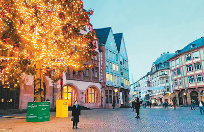 “往年,從12月1日開始,法蘭克福的大街小巷就張燈結綵,聖誕市場裏都是忙着採購的人羣。今年,德國各地的聖誕市場都因新冠肺炎疫情而被取消。法蘭克福老城中心的羅馬廣場上隻立着一棵孤零零的聖誕樹,幾乎看不到什麼人。”近日,德國萊茵之父集團董事長房心如給本報記者發來兩張照片:一張是往年聖誕節時的羅馬廣場,燈光璀璨,人流如織;一張是這兩天她路過廣場時隨手拍下的,只見亮起彩燈的聖誕樹下僅有零星的幾個路人。