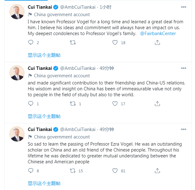 當地時間12月20日深夜,中國駐美大使崔天凱發佈數條推特,就美國知名中國研究學者傅高義(Erza Vogel)的去世表示哀悼。