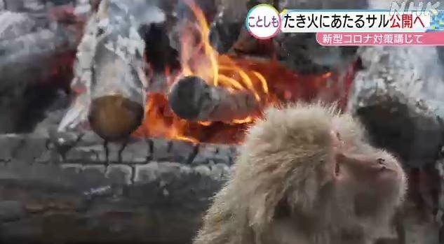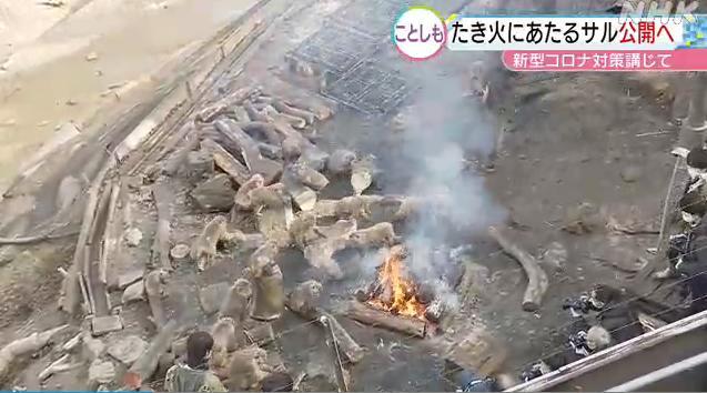 20日,日本愛知縣犬山市的“日本猴子中心”公佈了一段畫面,園內的猴子聚集在篝火旁邊“烤火”取暖,表情愜意。圖片來源:日本放送協會(NHK)視頻截圖