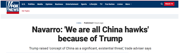 “唐納德·特朗普的偉大成就之一,就是強化了這樣一個概念,即中國是我們這個國家(美國)的威脅”,當地時間20日,白宮貿易顧問納瓦羅在接受《福克斯與朋友週末》節目採訪時用這種口氣給特朗普“樹立功勳”,納瓦羅稱,是特朗普推動了美國兩黨對中國採取更強硬立場,“現在,我們都是對華鷹派,我認為我們作為一個國家保持團結真的很重要。”