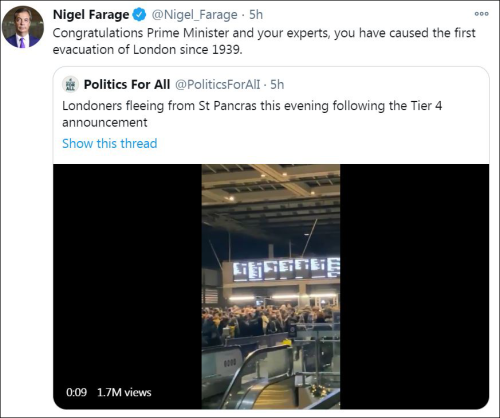 英國“脱歐黨”領袖奈傑爾·法拉奇(Nigel·Farage)在社交媒體上反諷道:“恭喜首相和您的智囊團,你們造成了1939年以來的首次‘倫敦大撤離’。”