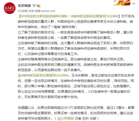 對於率先接種新冠疫苗的重點人羣,中國疾控中心免疫規劃首席專家王華慶從接種前、接種中和接種後,給出了一整套“接種攻略”。
