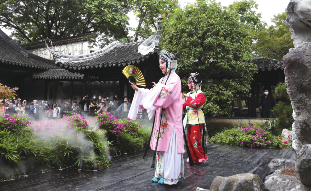 10月7日,演員在蘇州留園為遊客表演實景版崑曲《牡丹亭》