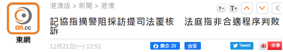 【環球網報道 記者 尹豔輝】據香港“東網”12月21日報道,香港記者協會此前曾污衊警方在過去近一年來多次阻礙記者採訪及對記者使用暴力,去年向香港高等法院申請司法複核。高院法官周家明今日(21日)頒佈判詞,裁定記協敗訴。
