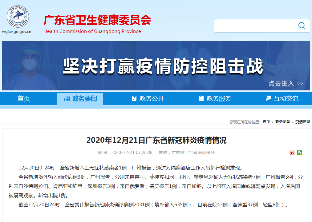 12月20日0-24時,全省新增本土無症狀感染者1例,廣州報告,通過對隔離酒店工作人員例行檢測發現。