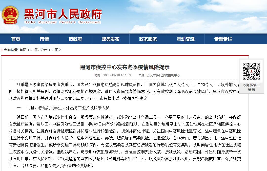 黑龍江省黑河市疾控中心:雙節期間大量人員湧入,請市民不聚餐不聚會