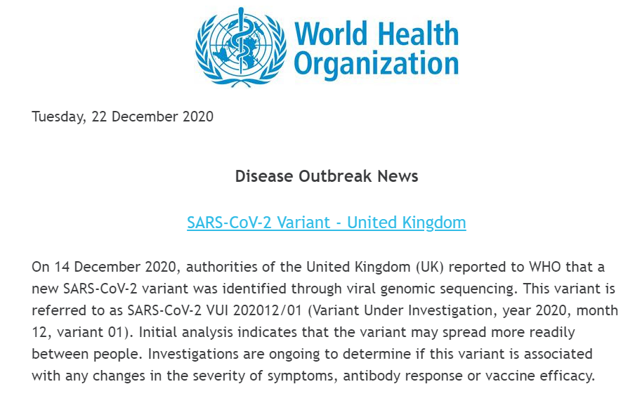 當地時間22日,世衞組織發佈英國上報的有關變異新冠病毒的相關信息。12月14日,英國向世衞組織報告,通過病毒基因測序發現一種新的新冠病毒變體。初步分析表明,該變體更易在人與人之間傳播,估計傳染性增加40%-70%,傳播指數增加0.4在1.5-1.7之間。截至12月13日,英國共檢出1108例感染了該變異病毒的病例。