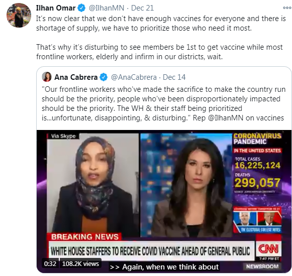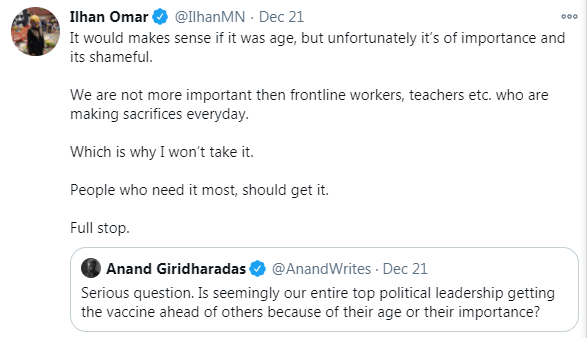 RT稱,當被問及國會議員優先接種疫苗是否是因為“他們的年齡或重要性”時,奧馬爾在推特上寫道:“我們並不比每天做出犧牲的一線工作人員、教師等更重要。這就是為什麼我不會接種(疫苗)的原因。最需要它的人應該得到它。”↓