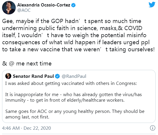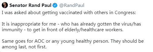 RT稱,克魯茲發文的幾個小時前,肯塔基州聯邦參議員、共和黨人蘭德·保羅發文,點明瞭民主黨人亞歷山德里婭·奧卡西奧-科爾特斯,後者上週在社交媒體上直播疫苗接種過程。在保羅看來,“任何年輕、健康的人”都應該是最後一批接種疫苗的人,而不是第一批。保羅還誓言稱會讓高危羣體在他前面接種疫苗。保羅稱,今年早些時候自己曾感染過新冠,他對這種病毒已經有了免疫力。↓