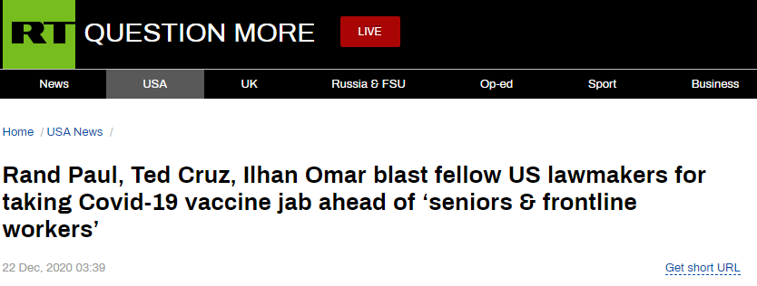 RT:蘭德·保羅、特德·克魯茲、伊爾漢·奧馬爾抨擊美國國會議員在“老人和一線工作人員”之前接種新冠疫苗