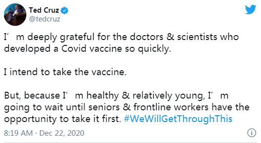 當地時間12月21日晚,克魯茲在推特上發文稱,“我非常感謝那些這麼快就研製出新冠疫苗的醫生和科學家。我打算接種疫苗。但是,因為我身體健康,而且相對年輕,所以我打算等到老年人和一線工作人員有機會率先(接種之後再去打疫苗)。”↓