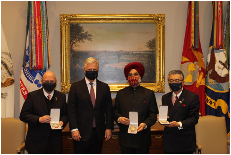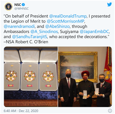 NSC推特賬號還再分別發推稱,特朗普向上述三個國家的前任或現任領導人授予勳章,以表彰於今年早些時候因健康問題辭職的日本前首相安倍晉三在“印度太平洋地區自由開放的領導作用和遠見”,印度總理莫迪“提升美印戰略伙伴關係方面所發揮的領導作用”,以及澳大利亞總理莫里森在“應對全球挑戰和促進集體安全方面的領導作用”。