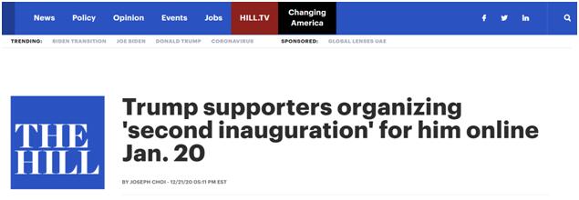 《國會山報》介紹説,該活動定於美國東部時間明年1月20日12時舉行,時間點正是拜登將宣誓就職美國總統的前後,並將由梅•沙米(Ilir Chami)和伊芙•科卡拉里(Evi Kokalari)主持。據報道,科卡拉里是特朗普2020年競選團隊成員。