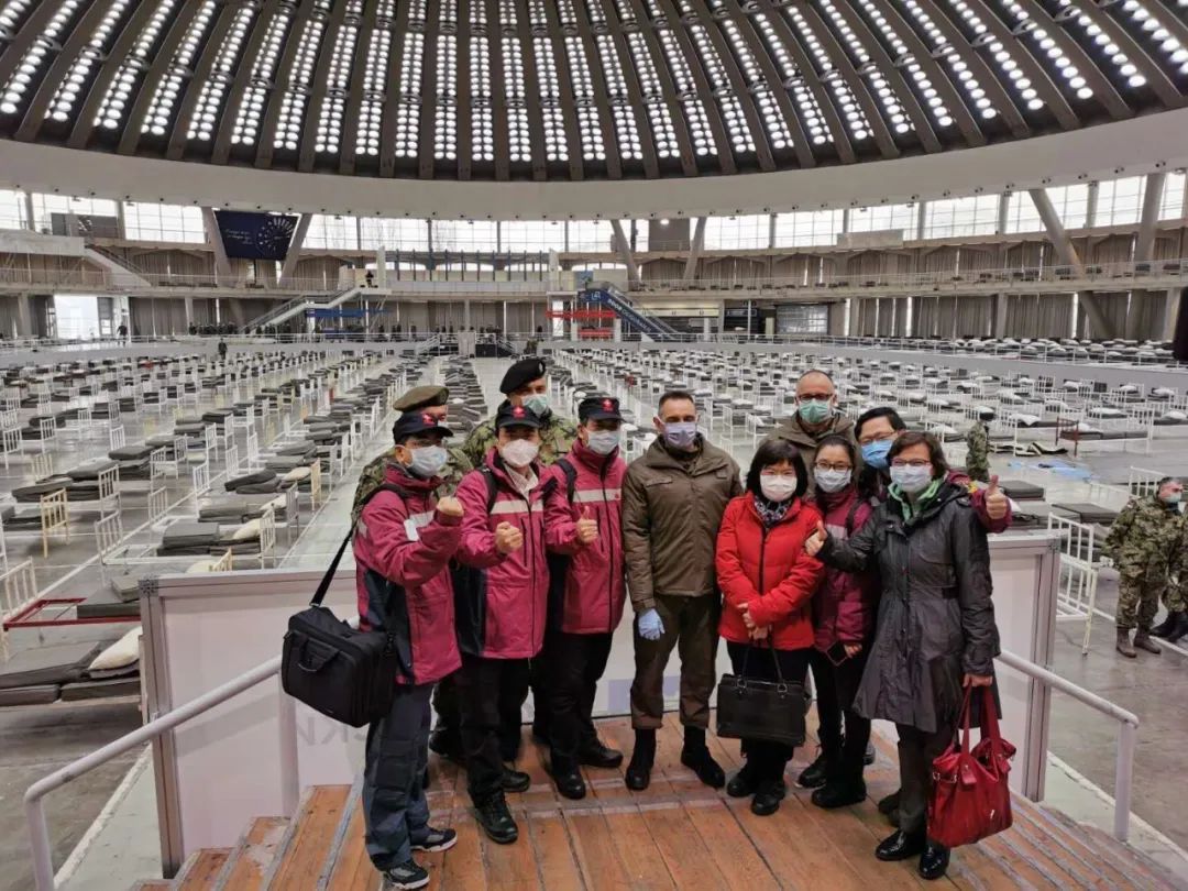 △中國專家組視察組建中的貝爾格萊德最大方艙醫院,右一為翻譯塔尼亞(專家組供圖)