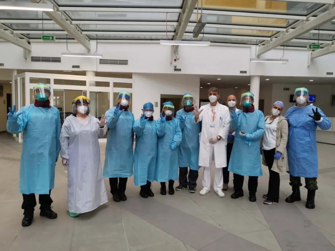 △中國專家組在當地醫院實地探查後與塞爾維亞同行告別,大家共同打出塞爾維亞式的“必勝”手勢。(專家組供圖)