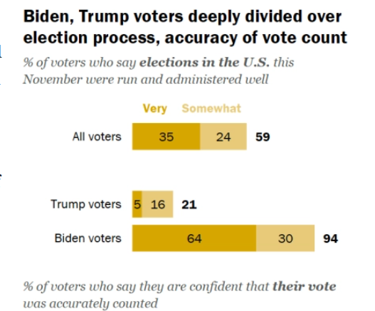 △皮尤研究中心對特朗普和拜登選民的調查顯示,特朗普的支持者中僅有21%認為競選中不存在“舞弊”,而拜登支持者中這一數據高達94%。