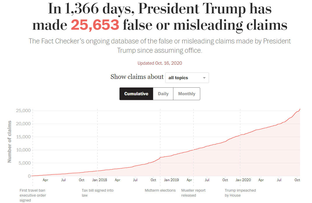 △截至美東時間7月13日,《華盛頓郵報》統計特朗普時期總統團隊在“錯誤信息”上的所有表述次數高達25653次,分析稱,通過發佈“錯誤信息”和帶有“誤導性的信息”,政客可以塑造個人形象、傳達某種特定立場和態度以及影響民眾認知。