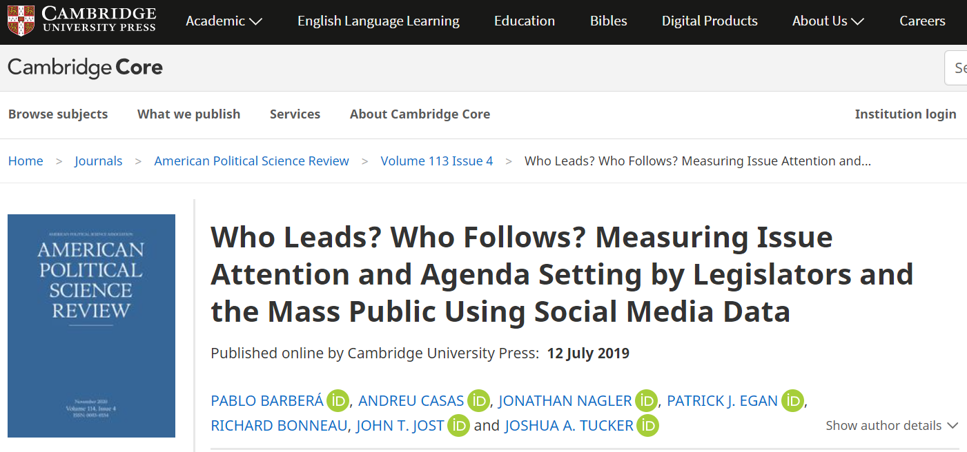 △學術期刊《美國政治學評論》2019年7月刊登的一項研究顯示,政客可以通過蒐集社交媒體上公眾的觀點、態度調整自己對相關事件的發言,並以相配套的政策手段支持該話術,從而實現“利用民意”的可能。