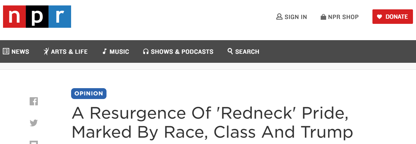 △美國國家公共廣播電台在2016年9月對在當年大選中突然活躍的“紅脖子”進行了報道,文章將這一羣體的“迴歸”與種族、社會地位以及特朗普團隊緊緊綁定在一起。