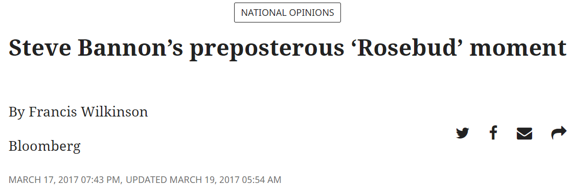 △2017年,彭博社發表評論,諷刺特朗普競選團隊負責人史蒂夫·班農更像是一個政治投機者。