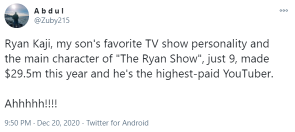 2020年的Ryan Kaji,又刷新了自己的記錄,太強了!