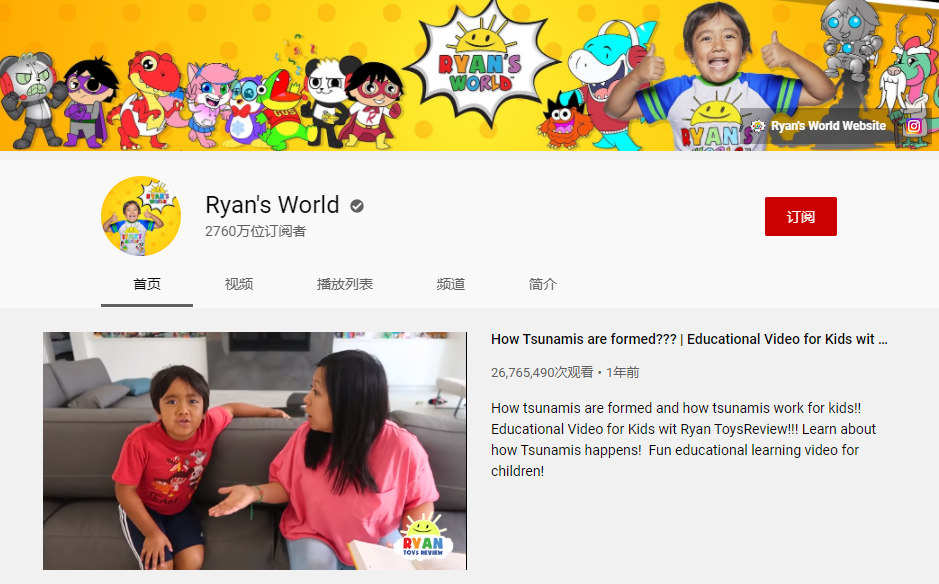 而現在,Ryan的頻道目前擁有2760萬粉絲,還擁有1個破20億觀看人次的視頻,破億觀看人次的視頻達到了驚人的40個!